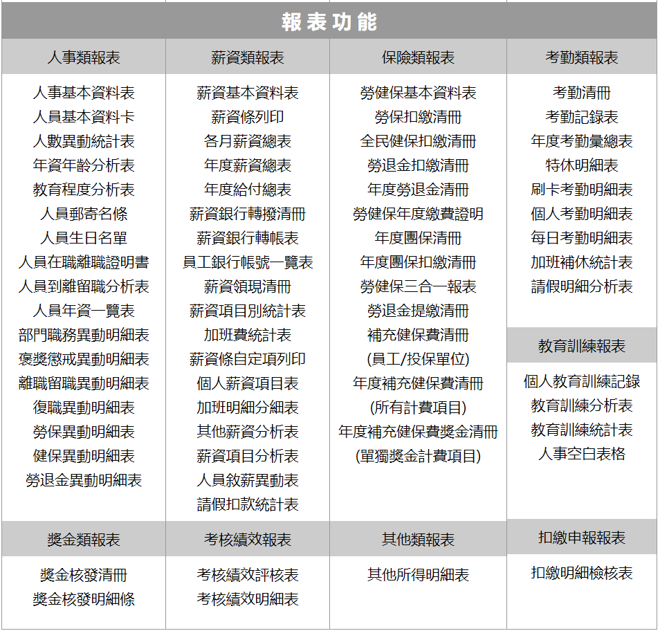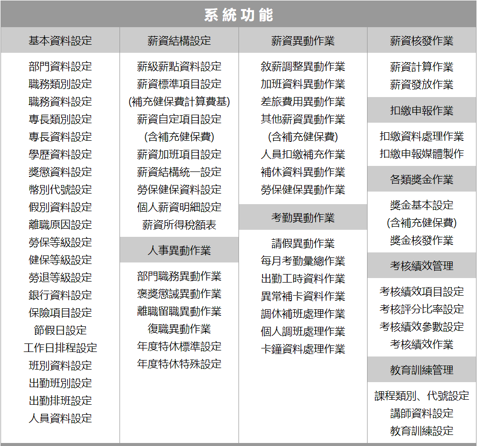 薪資項目可自行設定,並可自動計算所得稅、勞保、健保及勞退等金額。 提供完善的考績處理、教育訓練記錄。